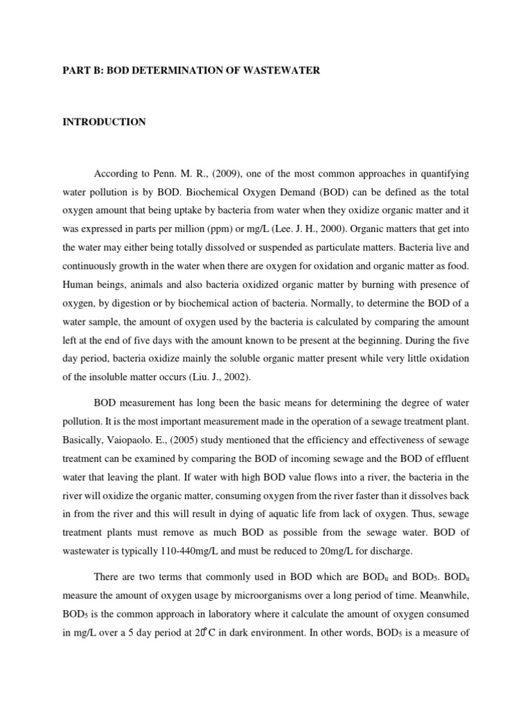 Biochemical oxygen demand bod date of experiment. BOD and COD Lab Report. Environmental engineering laboratory ecw 568 open-ended lab report title of experiment.
